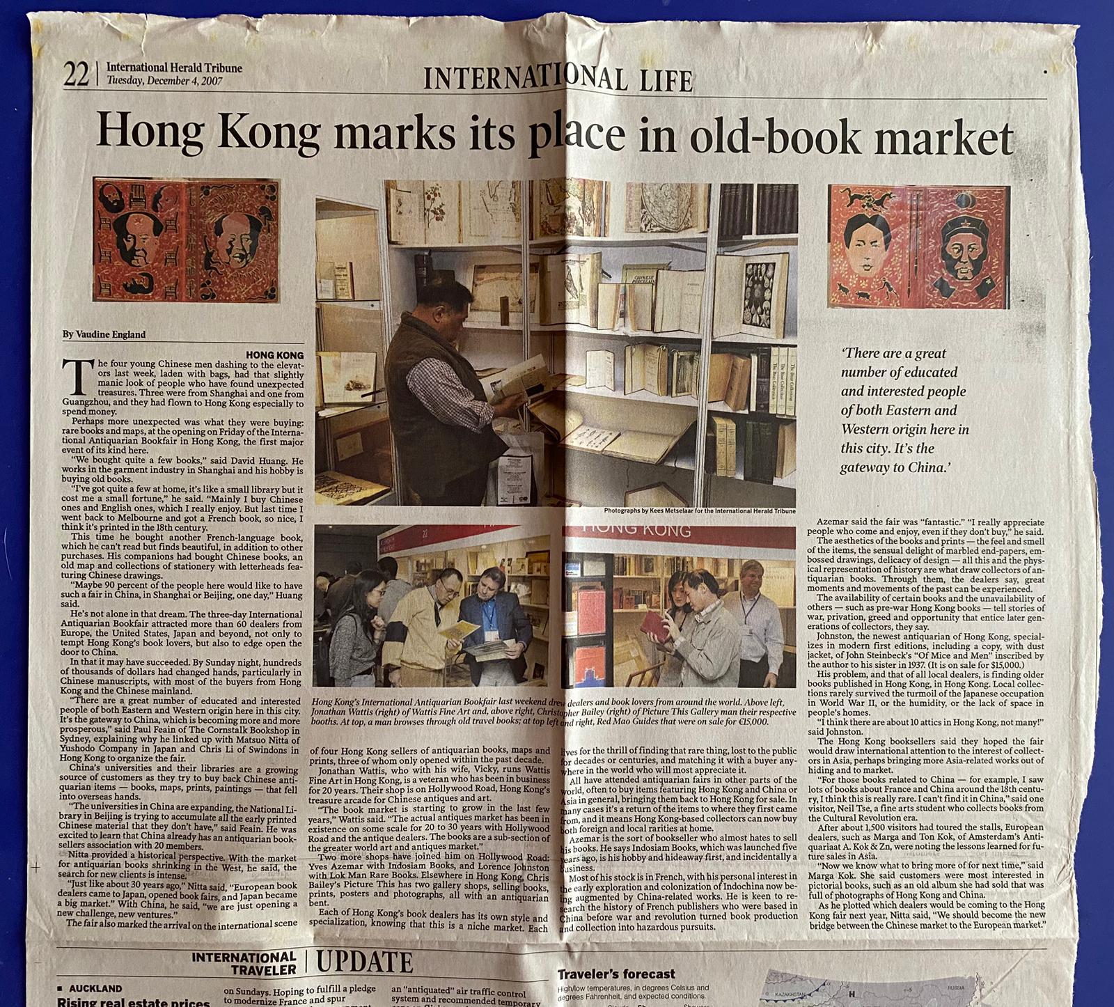 In the article, Australian bookseller Douglas Stewart reflected: “Hong Kong was my first international rare book fair, and as interesting and diverse as the city itself. The various rare book dealers’ exhibition stands all paid tribute to the importance and influence of Chinese culture in Hong Kong, but at the same time included fascinating gems which reflected their global origins. The result I felt was a success, with sales of works as different as German books on Peter the Great, American photographs of Java, and English charts of Vietnam… Hong Kong must rank as one of the most important new locations for the growth of the industry.”