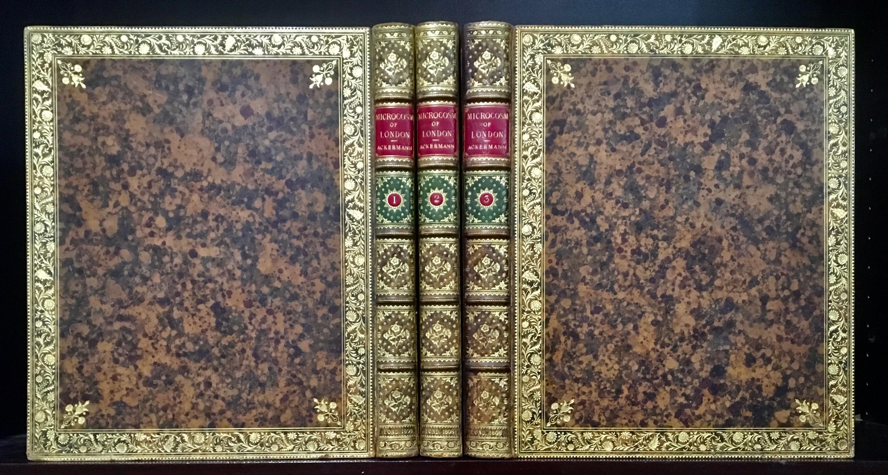 Three volumes. Mottled calf by Riviere, covers with gilt floral borders, raised bands, spine compartments with a floral sprig, red and green morocco labels. Half-titles, wood-engraved titles, engraved dedications, and 104 hand-colored aquatint plates by Buck, Stadler and others after Thomas Rowlandson and Pugin. Publisher's notice on the verso of the contents leaf in vol. III is in 8 lines.